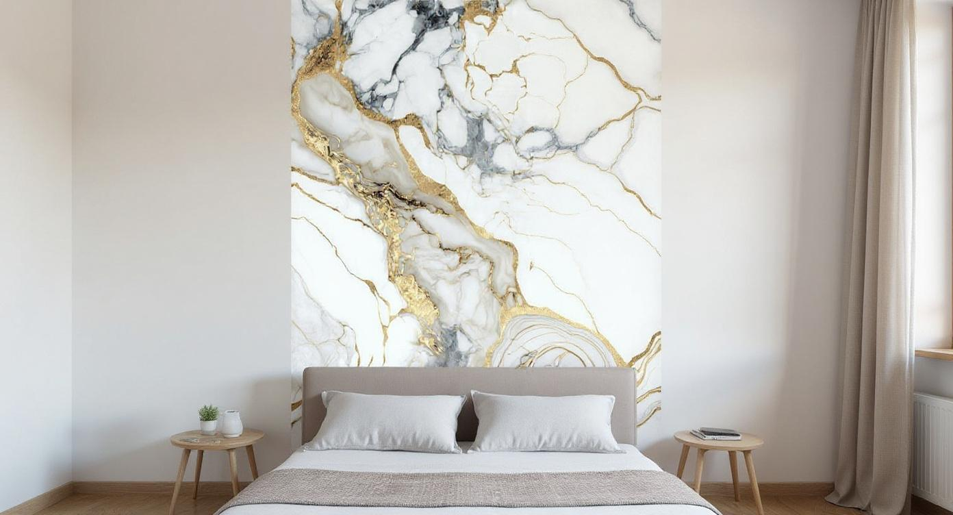 Chambre avec Plaque pvc marbre doré sur mur principal