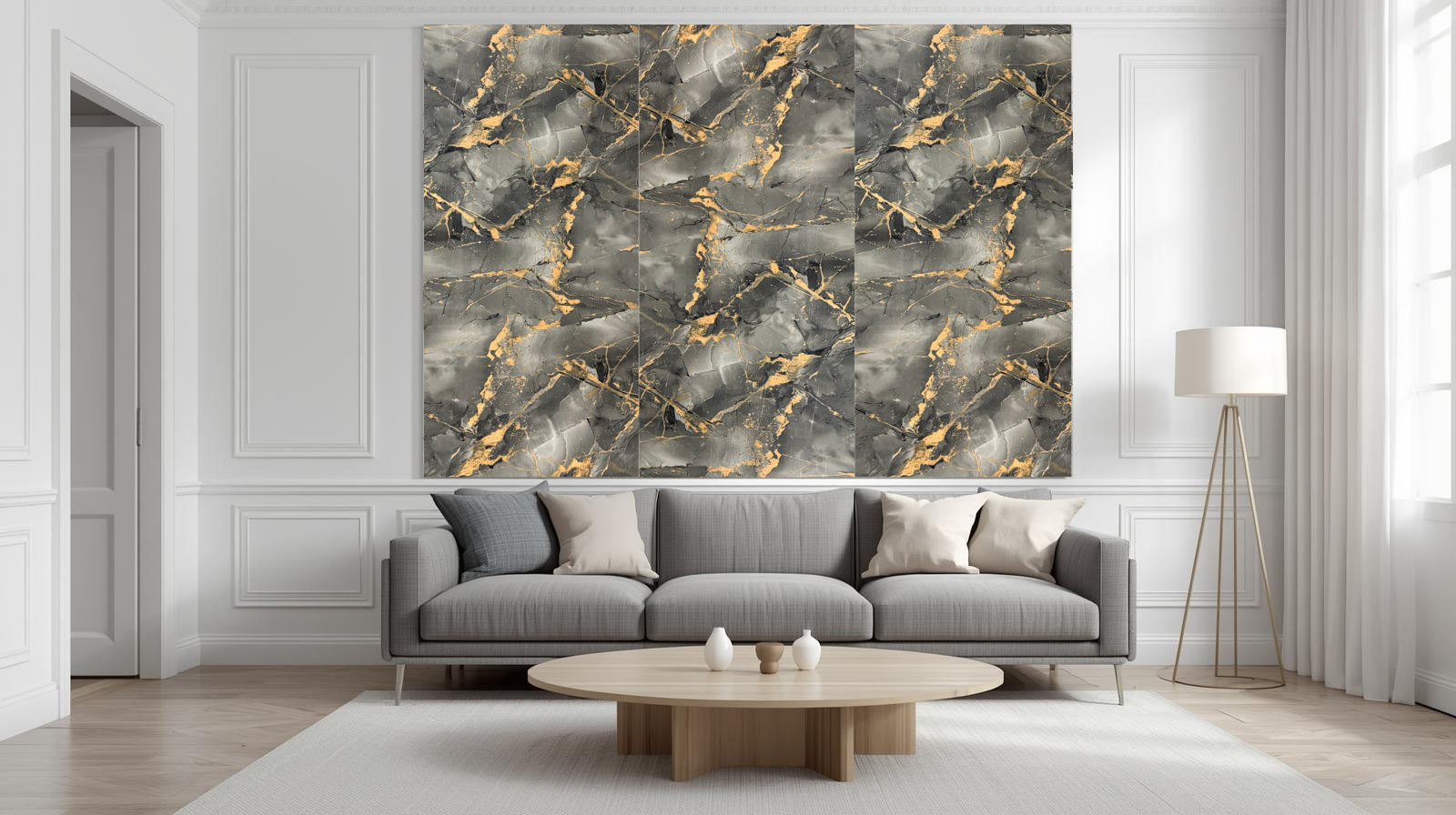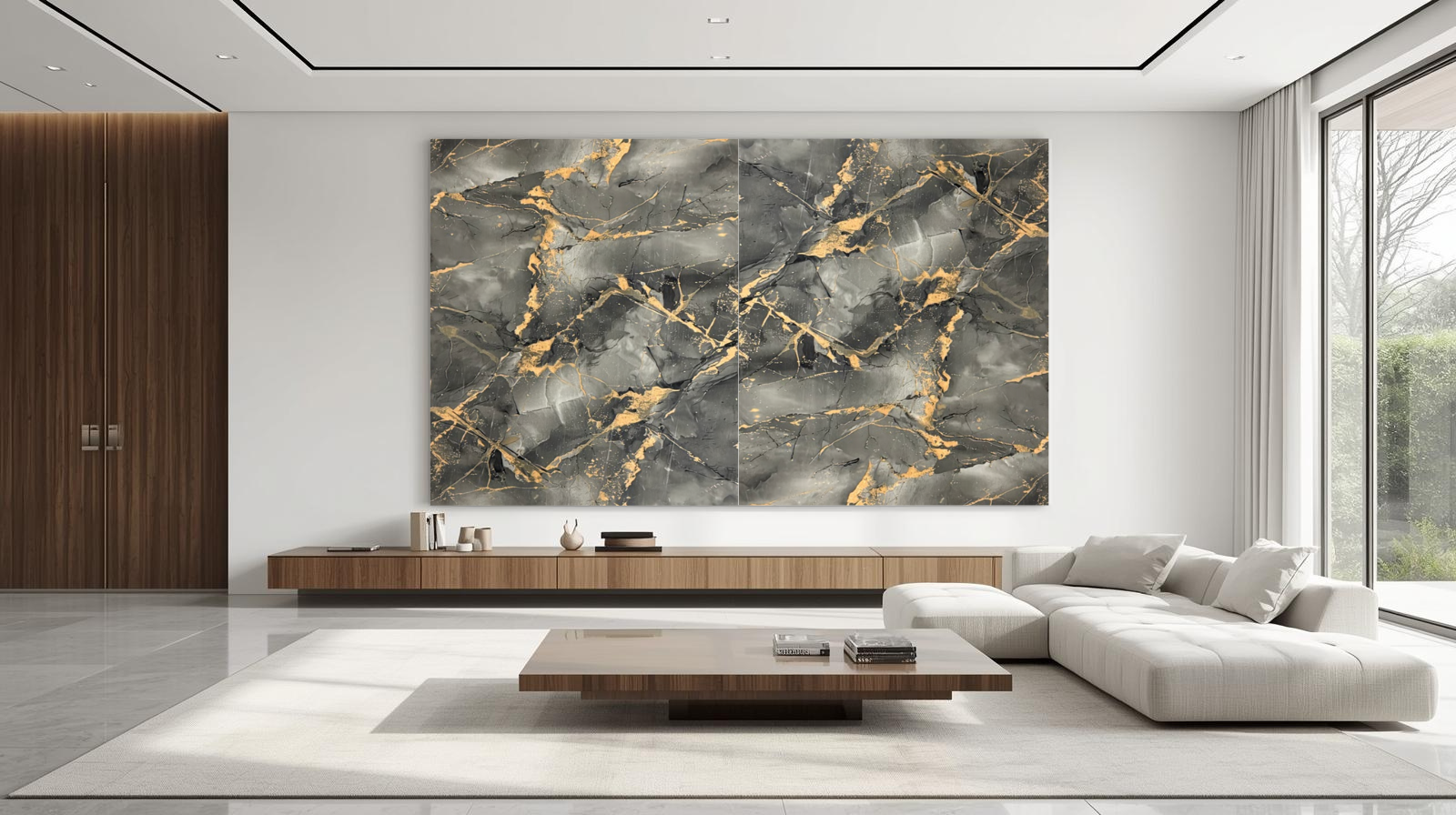 • Salon Moderne avec Mur Entièrement en PVC Marbre
